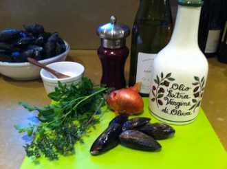 Mussels meuniere is a classic dish with many variations. But it is basically mussels steamed in dry white wine. We prefer a white wine with less (or no) oak- this allows the mussel flavor to come through. Oaky wines make for oaky mussels. The only other variables are the aromatics you can use. We go very basic, using only shallots, thyme, salt and pepper. You can add garlic, bay leaf or other seasonings to fit your taste. Also, it is good to have some crusty bread to soak up the broth (this may be the best part).