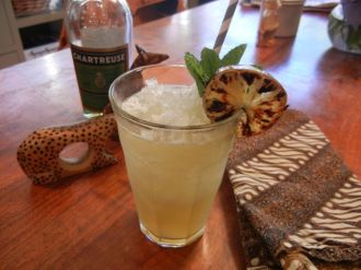 Sometimes it’s fun to just follow the muse. I stumbled on the Chartreuse Swizzle at the excellent tiki cocktail blog “A Mountain of Crushed Ice”. It is a tiki cocktail blog, written by Helena “Tiare” Olsen a Swede who is in love with New Orleans and tiki cocktails. The world is indeed becoming smaller. The blog is full of joy, passion and great cocktail recipes. I’ve become an instant fan.I found this recipe and was immediately smitten. I have been enjoying Chartreuse in Last Word cocktails, and this drink seemed too fun not to try. The drink features green Chartreuse, aged rum, pineapple, lime, falernum and bitters- all good stuff. The suggested caramelized lime garnish is way over the top, but this is a tiki drink, so why not?