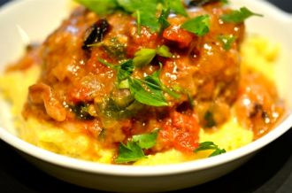 9. To finish the dish, transfer the necks to a deep dish or tray to catch any juices, and cover with foil to keep warm. Remove any excess fat from the braising liquid. Stir in the olives and parsley and then add the juice of one lemon. Taste and season with salt and pepper, add more lemon juice as needed.  Place the necks back the braising liquid to reheat for a few minutes. Serve lamb necks over polenta (or other starch), ladle the sauce generously over the lamb neck. Garnish with parsley, if you like.