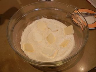 2. Cut the butter and shortening into small pieces and then add to the dry ingredients. Using a pastry blender or fingers, combine the butter and shortening with the dry ingredients. When the mixture is combined but has uneven, large and small crumbs, it is done. Don’t over-mix.