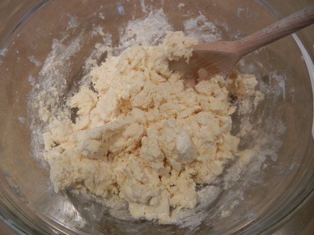 As for the wet ingredients, you whisk an egg into some cream (you can use milk or half and half, but cream will yield a more tender biscuit) and then add them to the dry ingredients. Now the key is to stir just until the mixture is combined. Do not stir too much.