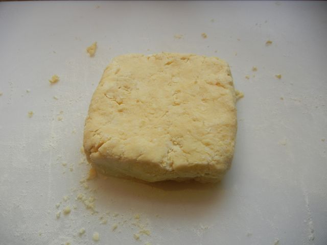 5. Dump the dough onto a floured surface. Lightly knead the dough until it just holds together and then form into a 6 x 6 inch square. Wrap in plastic and place into the freezer for 1 hour.
