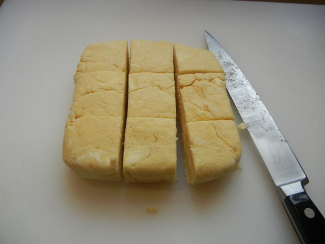 7. After 1 hour, remove the biscuit dough from the freezer, unwrap it and place it on a cutting surface.