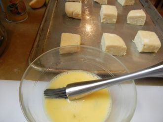 At this point we take the extra step of creating an egg wash and brushing it on top of the biscuits. This yields a nice, golden color to the top of the biscuits, but is an optional step. Finally you place the biscuits into the oven for 16 minutes (or until a light golden brown). Once done, you remove the biscuits from the oven and serve.