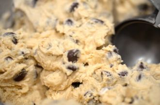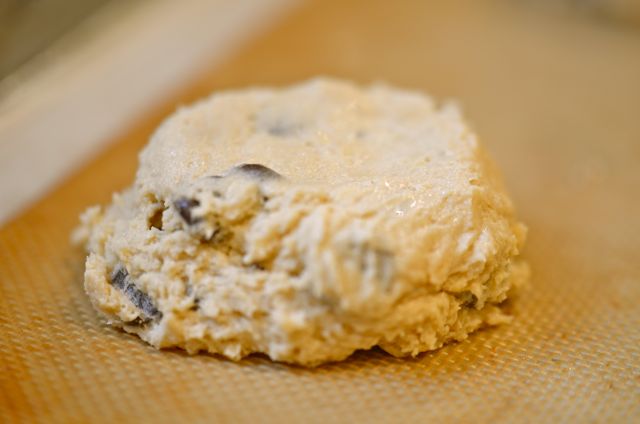 4. Form cookies using an ice cream scoop or large disher and place on the cookie sheet. You want 6 cookies for a medium-sized cookie sheet. Use wet hand and flatten cookies to 3-5 inch width.