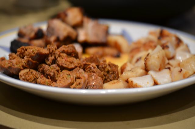 Taco night: Salvadoran chorizo, seared sea scallops and pork belly.
