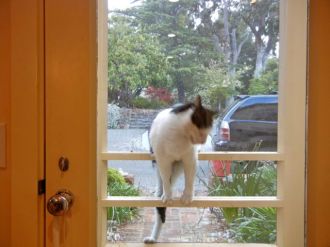 Oreo is a great cat, affectionate and playful inside and a stone-cold killer outside. Happily, Oreo mostly leaves the birds alone and focuses on rodents, lizards and the occasional snake. Since we don’t like semi-dead snakes being brought into the house as “gifts”, Oreo does not have a pet door. But as you can see, Oreo seems to think she does. The screen door has been no match for the cat. She can climb through the hole in the screen, but prefers to perch in the hole and “remind” us that she would like to come in. Funny stuff that gives you a smile in the morning- no so much at night.