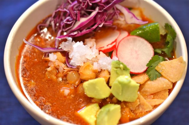 Posole is a light stew of chiles, hominy (corn treated in lye, don’t worry it’s fine- we use the same stuff for grits) and pork that’s served with a vast array of garnishes. It is the perfect “weekend” soup and will please almost any crowd. The dish is also much lighter and “brothier” than you might think- it is actually a pretty healthy dish. But don’t let that stop you, it tastes great. We are big posole fans and Maricela was kind enough to cook with us, share her recipe and help us make this batch. As a home cook, it does not get any better and cooking with a real expert, and Maricela gave us a great lesson and some key tips to making a super-tasty posole.