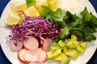 Finally, while the soup has been cooking, you can prepare the garnishes, which are what elevate the posole to a truly great dish. The variations are endless, but most posole is served with shredded cabbage, minced onion, sliced radish, lime, avocado, cilantro, hot chile sauce and tortilla chips. The final “special” trick we got from Maricela is to crumble dried oregano into the soup right before serving- and she was right on. The oregano adds a great aroma and deepens the flavor of the broth. This posole just rocks.