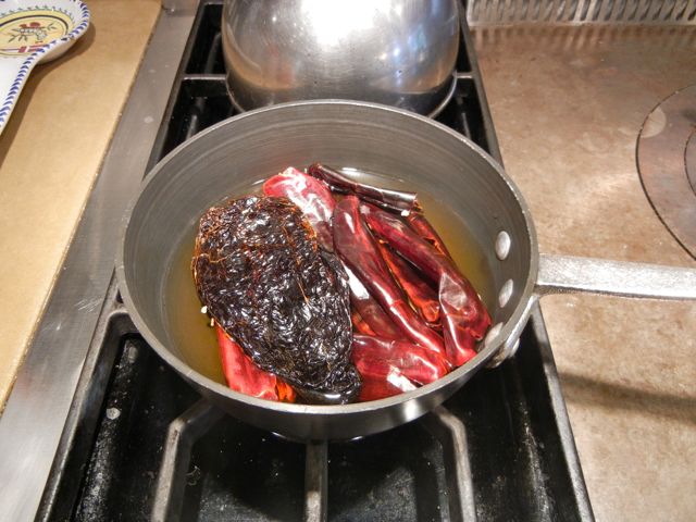 As is the case with many of the better Mexican dishes, the techniques are simple, but there are a few steps that you must follow to get the best results. The process starts with a mix of 4 ounces of dried pasilla and gaujillo chiles and about 8 cloves of garlic. You remove the stems and seeds from the chiles, skin the garlic cloves and then simmer all of them in 3 cups of water for 25 -30 minutes, or until the chiles are rehydrated and soft.