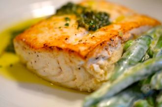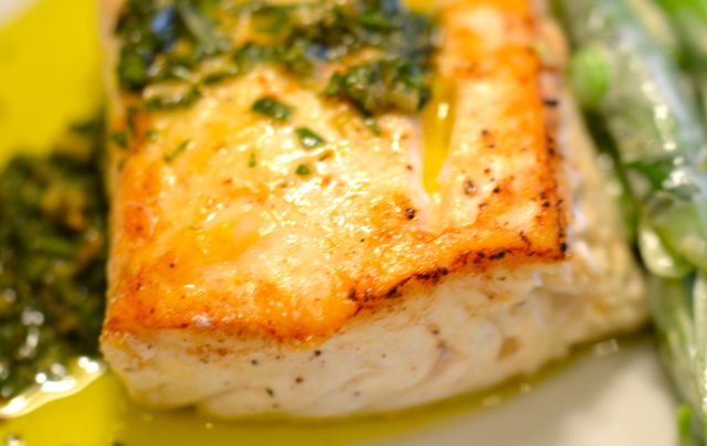 - To serve, place the halibut on a plate then add a tablespoon, or two, of the sauce. Add a healthy dollop of salsa verde to the fish. Serve along with the sugar-snap peas, if you like.