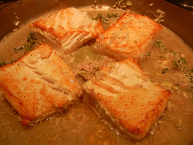 Making the halibut is a bit more complicated, but worth the effort. The core of the recipe is starting cooking by searing the fish, then finishing the cooking by steaming the fish in a lidded pot in the oven. Searing provides better presentation, texture and flavor while steaming keeps the fish from overcooking and provides the base for a sauce.