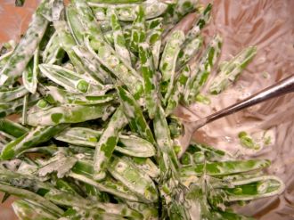 - 8 oz. fresh sugar snap peas, strings removed and sliced in half lengthwise