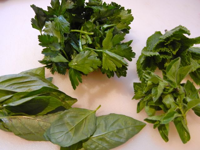 Making salsa verde is as simple as cooking gets. Just chop a bunch of fresh herbs like parsley, mint, basil and marjoram, and then add some garlic, anchovy, capers, seasonings and olive oil. Add some acidity with vinegar and mustard (we added a dash of lemon juice). Mix, taste, adjust. Then serve the salsa verde to brighten the flavor on almost anything.