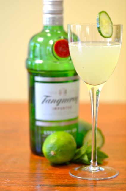 1. Place the mint leaves and cucumber in the bottom of a cocktail shaker and muddle (if you do not have a muddler, use the end of a wooden spoon).