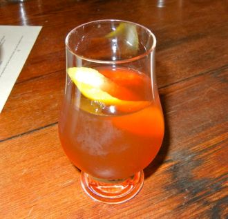 The next creation we tried, the Argyll, takes us to the other side of the cocktail spectrum. A combination of Springbank 12 year old scotch, Cherry Heering and Green Chartreuse, the Argyll is a “night-time” drink. But this is a fascinating concoction. The question of using of single-malt scotch in cocktails is sometimes contentious (and potentially expensive). But respected mixologists like Gary Regan and Jim Meehan make the point that if done well, a drink with single-malt scotch provides a whole new range of flavors outside of most traditional cocktails. In this case, the scotch provides the dark, peaty flavors and some heat (Springbank 12 yr. is strong, boozy stuff), the Cherry Heering adds sweetness and fruit and the Chartreuse features herbal notes. The Springbank still leads, but the flavor profile is expanded beyond the scotch. The Argyll may not be for purists, but it’s a creative drink that many will enjoy.