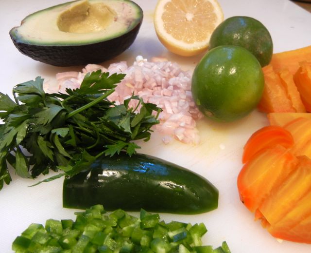Once your prep is done, you can make the dressing and assemble the dish. The vinaigrette combines lime juice, shallot, jalapeño, salt and olive oil. It is a good idea to taste the jalapeño for heat, as it can vary by pepper, and adjust the amount you use in the vinaigrette accordingly. Once the vinaigrette is done you can add some of it to the crabmeat, taste and then adjust for volume and seasoning. This is a key step, take your time and start with less than half of the vinaigrette and adjust to your taste. We used half of the dressing and felt it was plenty, but the crab, pepper and the olive oil can all vary, best to taste and trust your taste buds.