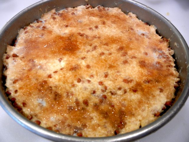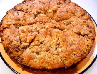 Bake the scones in a 375 degree oven for about 40 minutes, or until golden brown and firm to touch in the center. Cool for about ten minutes and then run a knife around the corner to loosen the scones and then place a plate on top.  Flip the pan to get the scones out on the plate, and then using another plate, flip the scones back over so the pretty side is on top. (At this point you could save the pan for yourself and scrape off the remaining tasty, crunchy bits of the cinnamon filling for a lovely snack….. just a thought).