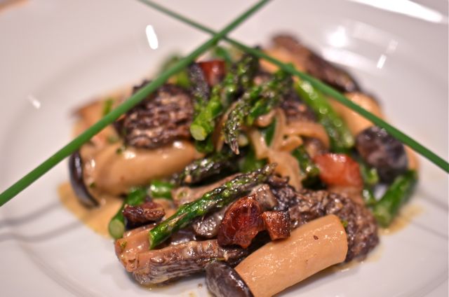 Now some will say that the morels should be served simply, with minimal additions, and that is great. But the morels play very well with other flavors, particularly earthy, sweet green vegetables like asparagus (fiddleheads are also good, if you can get them). And why not add some home-cured bacon, a touch of shallot, cream and some fresh thyme? And morels are really expensive, so we add some other meaty mushrooms (we use king trumpets) to the recipe to as well. And in a pinch, you can just use other mushrooms altogether. The flavors will still be good.