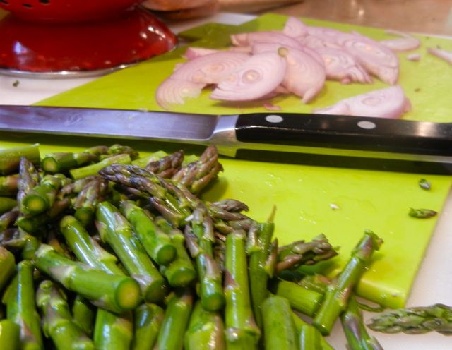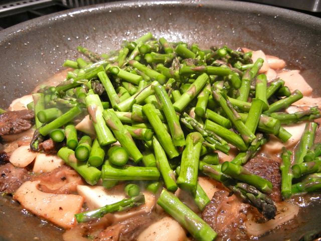 Making this dish is a simple one-pan operation. Most of the work is in prep. Clean and slice the mushrooms, asparagus and shallots and set aside. Cut some bacon into cubes or strips and brown, remove the bacon pieces and reserve, but keep the bacon fat in the pan. (You could skip the bacon and just use olive oil). Add the shallots and mushrooms and cook until they give up their liquid and it is mostly reduced. Add the thyme, then deglaze with some white wine and then add the asparagus. Cook the asparagus for a few minutes then add the cream, reduce for another minute, add the bacon and then check seasoning. Adjust seasoning as needed and serve.