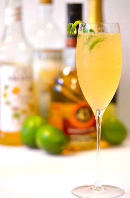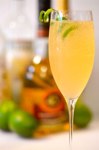 2. Top with the champagne and add the lime twist. Serve.