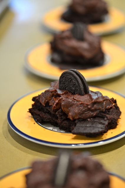 The work with this cake is in the assembly. This is a big cake. We use sheet pans for this size cake, which are slightly easier to handle. Carolyn also shaves off the domed tops of the cakes. This is extra work, but the cake is much more stable and easier to frost if totally flat. But this is where we get the bonus dessert. You simply combine the extra cake shavings with left-over frosting on a plate, then add any garnish you like. Carolyn put an Oreo cookie on top, but fruit, coconut, ice cream or whipped cream will all be very welcome additions. And if you like frosting, this is for you. We call it “Chocolate Mess” and it lives up to its name.