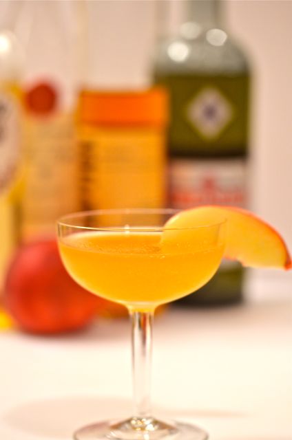 3. Double strain (the peach pulp can be thick) into a chilled cocktail glass or coupe. Garnish with peach slice and serve.