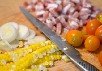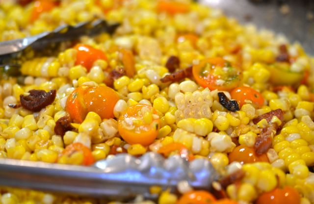 2. Place a large skillet over medium-high heat. When the pan is hot, add the olive oil and the bacon. Cook the bacon until brown, about 4-5 minutes. Add the onion and cook until soft, another 2-3 minutes. Add the corn kernels and cook until some (but not all) brown and caramelize, another 3-4 minutes. Finally add the tomatoes and cook until they start to melt into the corn, another 2-3 minutes. Taste and season with salt and pepper. Remove from the heat.