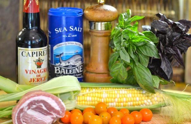 The corn salad combines just a few flavors, but they combine well and still highlight the sweetness of the corn. To start, cut the kernels from about 6 ears of corn (assume 1/2 cup of kernels per ear). Use a large bowl or plate, this is messy work. Otherwise, using medium-high heat, brown some bacon (omit for a vegetarian dish), then soften some sweet onion. Add the corn kernels and sauté until some slightly caramelize, it will take just a few minutes. Add some halved cherry tomatoes and cook until they start to “melt” another 2-3 minutes. Taste and season with salt and pepper. Take the pan off the heat and then add the basil and the sherry vinegar. Stir and serve. Or set aside to cool. The salad is good warm, room temperature or even chilled.