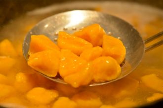 2. Scoop out 2 cups of the squash into a large bowl. Mash thoroughly with a fork. Add the salt, white pepper and nutmeg. Add the flour 1 cup at a time, and mix with the squash. Slowly add the 3rd cup of flour until the dough pulls away from the side of the bowl. You do not have to use all of the flour.