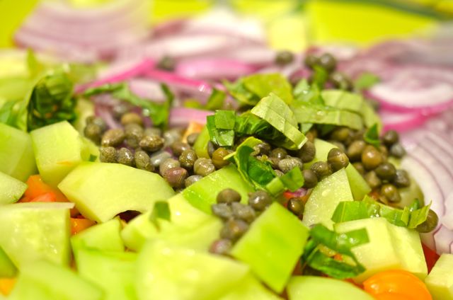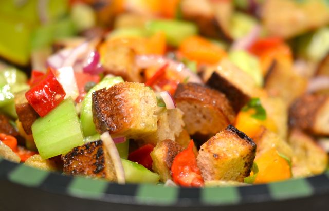 3. Chop all of your vegetables add place into a large mixing or salad bowl. Add the basil and capers. Add the vinaigrette (don’t do it all at once, add half and see what you need to add) and toss thoroughly. Add the bread cubes and toss again. Taste for seasoning and add salt and pepper as needed. Serve immediately or let the flavors meld 15-30 minutes before service.