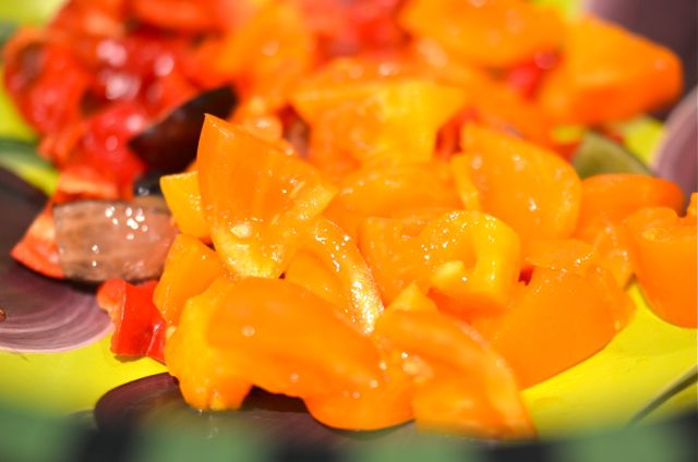 • 2 sweet red and/or yellow peppers seeded and cut into 1 inch cubes