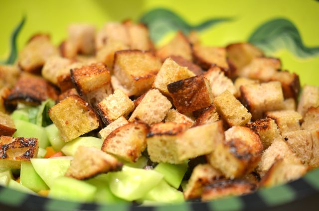 And it does help if the dish actually tastes good, and Panzanella is often a delicious dish. But like many “classic” dishes there are plenty of recipes, not always good, and some details that make the most of the ingredients. We use an adapted recipe from Ina Garten that keeps things simple but has a lot of summer flavor (and uses up our veggies). The key step in this recipe is making croutons with the bread, and not just soaking stale bread. The warm, crunchy and salty croutons mix perfectly with the veggies, herbs and vinaigrette. And if you can chop vegetables and make vinaigrette, making the rest of this recipe is as easy as it gets. And if you have other ingredients you want to add, feel free- purists may cringe, but there are all sorts of Panzanella recipes out there. Find one you like.