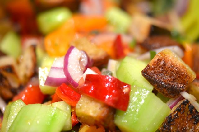 As we move into Indian Summer, we often find ourselves torn. We start to see sign of fall and are tempted by fall flavors, but in reality our garden is still brimming with tomatoes, peppers and cucumbers. Happily there are plenty of good summer vegetable dishes to address this late-summer abundance. We already enjoy Caprese Salads and Gazpacho on regular basis. We make Ratatouille  (particularly to use up the eggplant). And whenever there is some country bread around we make Panzanella, a Florentine salad of bread, tomato, cucumbers, peppers, onions and a vinaigrette.