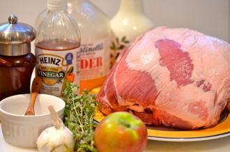 - Add the apples and onion to the pot with the apple cider. Then place the roast on top of the apples and onions, put the lid on the pot and place it in the oven. Cook for 4-6 hours, or until the roast reaches an internal temperature of 190 degrees. Remove the roast from the oven and let it rest for at least 15 minutes. Slice and serve.