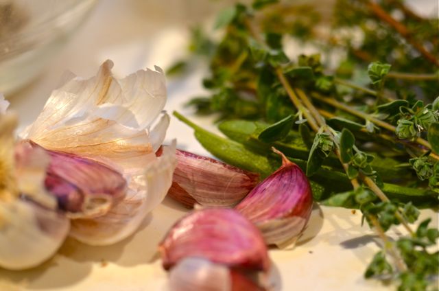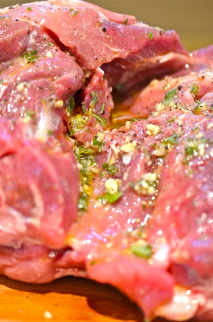 Making the dish is easy, but is a 2-day project. It also has a few extra steps, but they make the difference between a “good” and “great” roast. On day one you make the mojo by chopping fresh herbs (thyme, sage, oregano and rosemary all work) and garlic and then mixing with olive oil, vinegar, salt and pepper. Then you take your pork shoulder (untie it, if already tied), poke a bunch of holes in it and rub the mojo all over the pork. Be sure to cover all the pork, inside and out and push the mojo into all the holes. Then wrap the pork or place it in a large container in the fridge overnight, or up to two days, the mojo will flavor all the meat. The whole thing should take about 15 minutes.