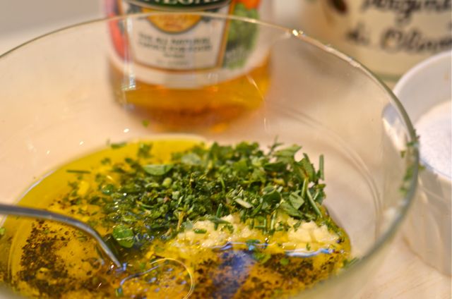 - Combine the fresh herbs and minced garlic with the olive oil, vinegar, salt and pepper. Mix well.