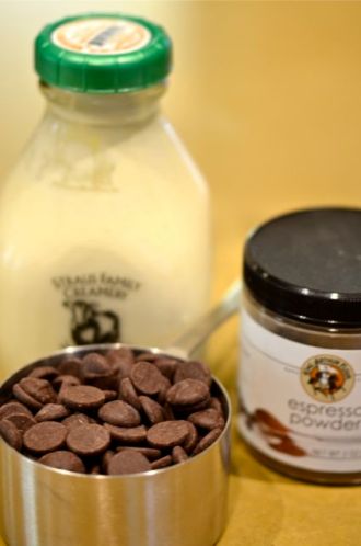 - To make the chocolate sauce, place the cream in a microwave-safe container and heat in the microwave until just boiling. Meanwhile, place the chocolate chips in a heat-proof bowl. Remove the cream from the microwave, stir in the espresso powder and then pour the hot mixture over the chocolate chips. Stir until the chocolate and milk combine and the sauce is smooth and glossy, about 1 minute. Serve.