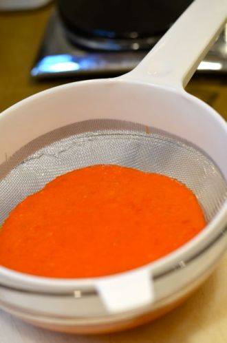 Happily, once you cook the peppers and the air clears, the rest of the process is easy. Process the pepper mixture with an immersion blender, blender or food processor and add the vinegar. Then strain the sauce through a fine mesh strainer or Chinoise. Taste (just a bit) and add salt or more vinegar, to taste. Let the sauce steep for a few days (a few weeks will be better) and then use it however you like. We like the hot sauce with coconut rice or even as a dip for veggies. This hot sauce will clear your sinuses, but it does taste good.