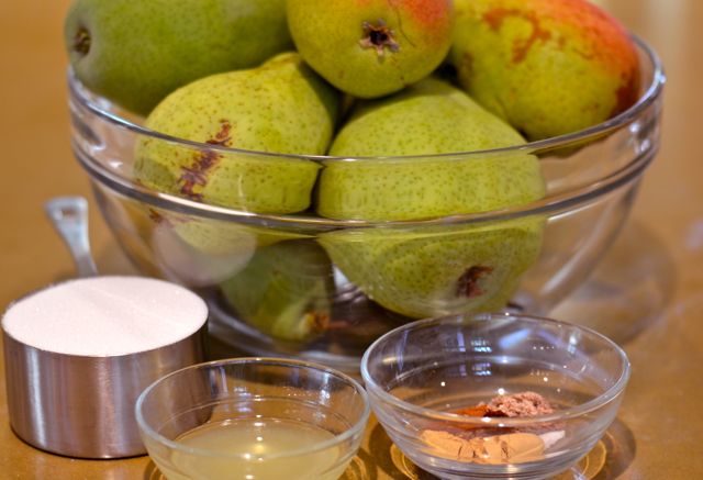 1. Place all the ingredients into a large heavy pot. Bring to a simmer over medium hight heat, stirring frequently. Lower the heat and continue to stir until the pears start to break down, about 10 minutes. You can mash the pear chunks with a wooden spoon to speed the process. Then cook for about 60 minutes.