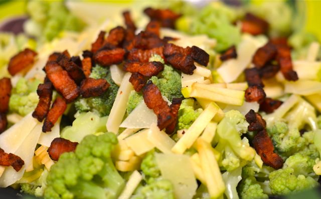 While we sometimes bitch and moan whine about winter vegetables this time of year, we do enjoy them quite a bit. It just takes a little more work to get the best out of them, and being as lazy as the next guy, we prefer more flavor and less work. In summer we put most fresh veggies on a plate with some olive oil and salt, or give them a quick sauté and voilà! Perfection (well, at least a good dish). In winter, we break out our thinking caps and some cookbooks and get to work. So when Carolyn brought home some purple broccoli and broccoflower (or romanesco, depending on appearance), we got off our butts motivated and made this salad. And it turned out well enough to make the blog, and become a regular dish here at the farm.