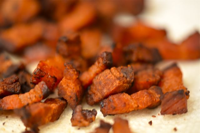 - Meanwhile place a small skillet over medium heat. Add the bacon lardons and cook until browned and crispy, about 5 – 10 minutes. Drain the bacon on a paper towel.