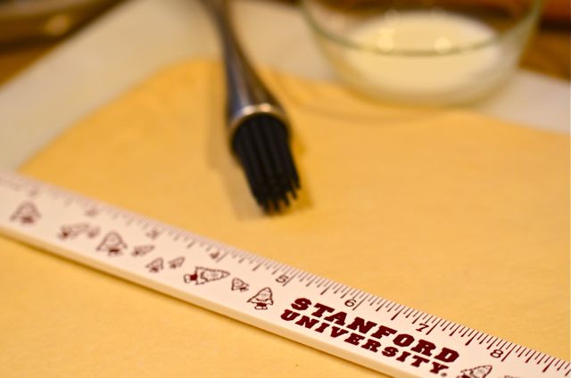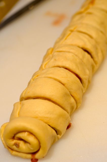- Brush the dough lightly with the milk. Then sprinkle the filling evenly over the dough, covering the entire surface. Roll the dough into a log the long way; it’ll stretch to about 20″ long as you roll. Using a serrated knife, slice the log into 16 slices. To cut down on friction and get a smooth cut, rinse the blade in hot water, and wipe it off, between slices.