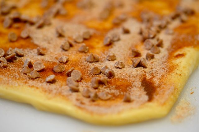 - To make the filling, whisk together the sugar, cinnamon, cinnamon chips and flour.