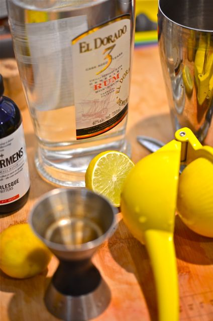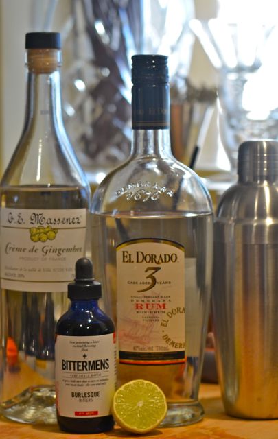 sunny2A few notes on the ingredients will help with the recipe. Firstly, we use filtered aged rum like El Dorado 3 yr. or Banks 5-Island. It turns out you can filter the color from aged, darker rums and keep most of their “funk” and flavor. This kind of rum let us change the color of the drink and is a good cocktail ingredient, but if you already have Goslings or other dark rum you can use it (you just get a deeper color, extra recipe below). As for Ginger Liqueur, there are a few producers and each type varies slightly in sweetness and spice. It is best to mix your first version with less ginger liqueur and adjust upwards if needed. And you may need a dash of simple syrup to add sweetness without adding too much ginger. We also add a dash of Bittermen’s Burlesque bitters for extra funk, but it’s totally optional.