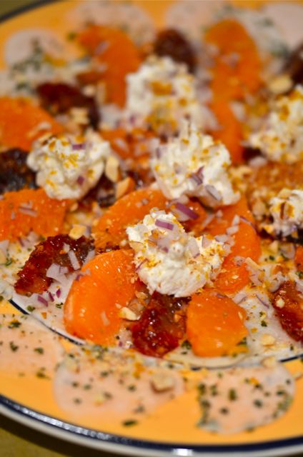 turnip5turnip7This salad combines marinated turnips with orange and blood orange supremes, a goat cheese and horseradish mixture and roasted nuts (Gillespie uses hazelnuts, we like almonds). While we simplify the recipe somewhat, we do keep some of the core techniques in place. The main trick here is to thinly slice the turnips and marinate them between two layers of plastic wrap. This may seem fussy (and you can skip it if you like) but this technique creates almost a vacuüm seal and really gets the flavor into the turnips. Worth a try. The other cool trick is to add some sour cream and prepared horseradish to the goat cheese, it adds real depth of flavor and the extra zip of the horseradish plays very well with both the turnips and oranges. A tiny dusting of curry powder at the end is also a nice touch and adds a little extra flavor and aroma.