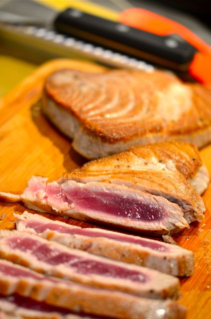3. Remove the tuna from the heat, cut into the steak to test for doneness. If the tuna is cooked enough, slice it immediately. If not, let the tuna steak rest and test again for doneness every 20-30 seconds, it will continue to cook in its own heat. Slice immediately when the tuna reaches the desired doneness. Set aside.