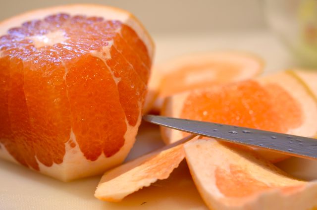 4. Over a bowl, peel the grapefruit and then cut supremes of the flesh from between each membrane. Place the slices in the bowl and then squeeze out any juice into the bowl.