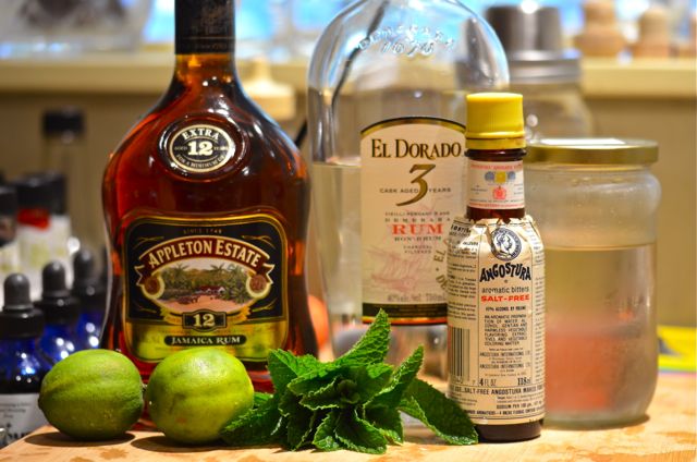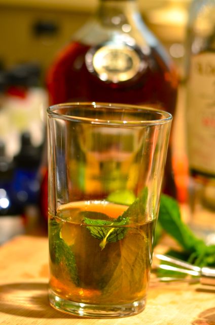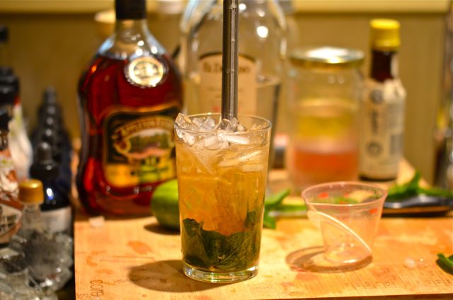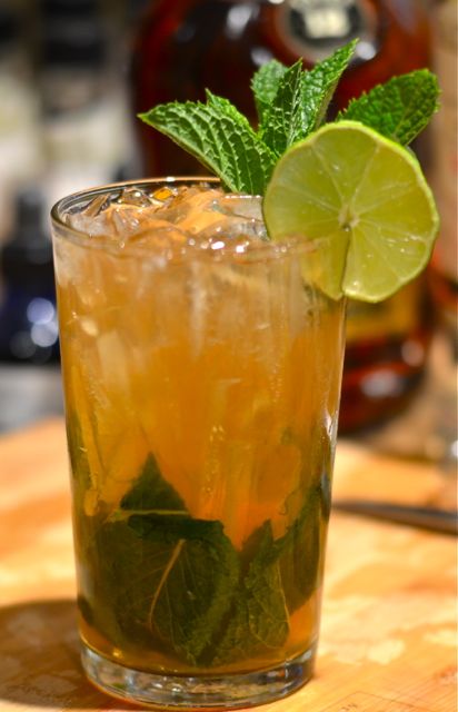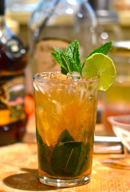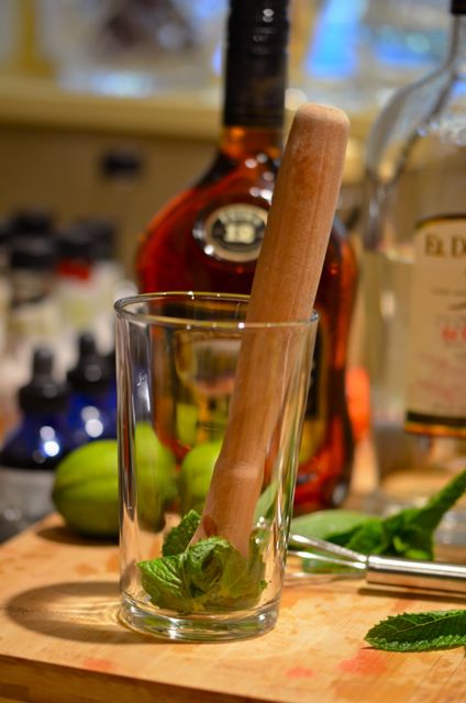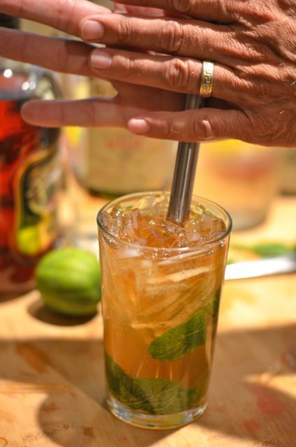 swiz2swiz4There are all sorts of swizzle recipes out there, but this one, The Queen’s Park Swizzle, is one of our favorites. A combination of mint, Demerara rum (we add some aged Jamaican rum), lime juice, sugar syrup and bitters, the Queen’s Park Swizzle is a simple, smooth and flavorful drink. It is also very strong, with almost double the normal amount of booze, but these drinks are meant to be nursed over time. As it is, we usually have only one (and if we had two we probably wouldn’t remember anyway).