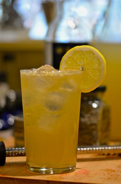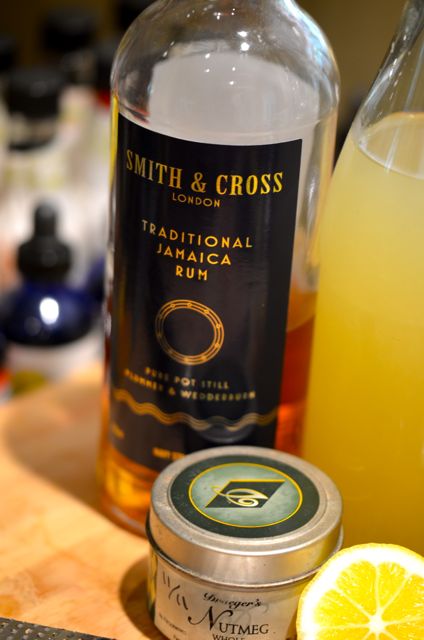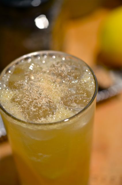 expat6expat1Boston Expat Punch is based on the traditional Boston Punch. Boston Punch is simply lemonade and dark, aged rum, sometimes with grated nutmeg. Back in the day, this was the stuff Paul Revere drank when he wasn’t brewing beer. Our version just uses the sweeter and less acidic Meyer lemons (very common in Norcal) for the lemonade and we heavily suggest using the nutmeg. Wondrich also recommends using a very flavorful rum like Smith and Cross, which is very good but almost too much for some. As the Meyer lemons have a notably sweeter flavor, slightly lighter rums like Appleton V/X or El Dorado 3yr also work well. And even lighter rums will play, but then the nutmeg really helps to add some depth.